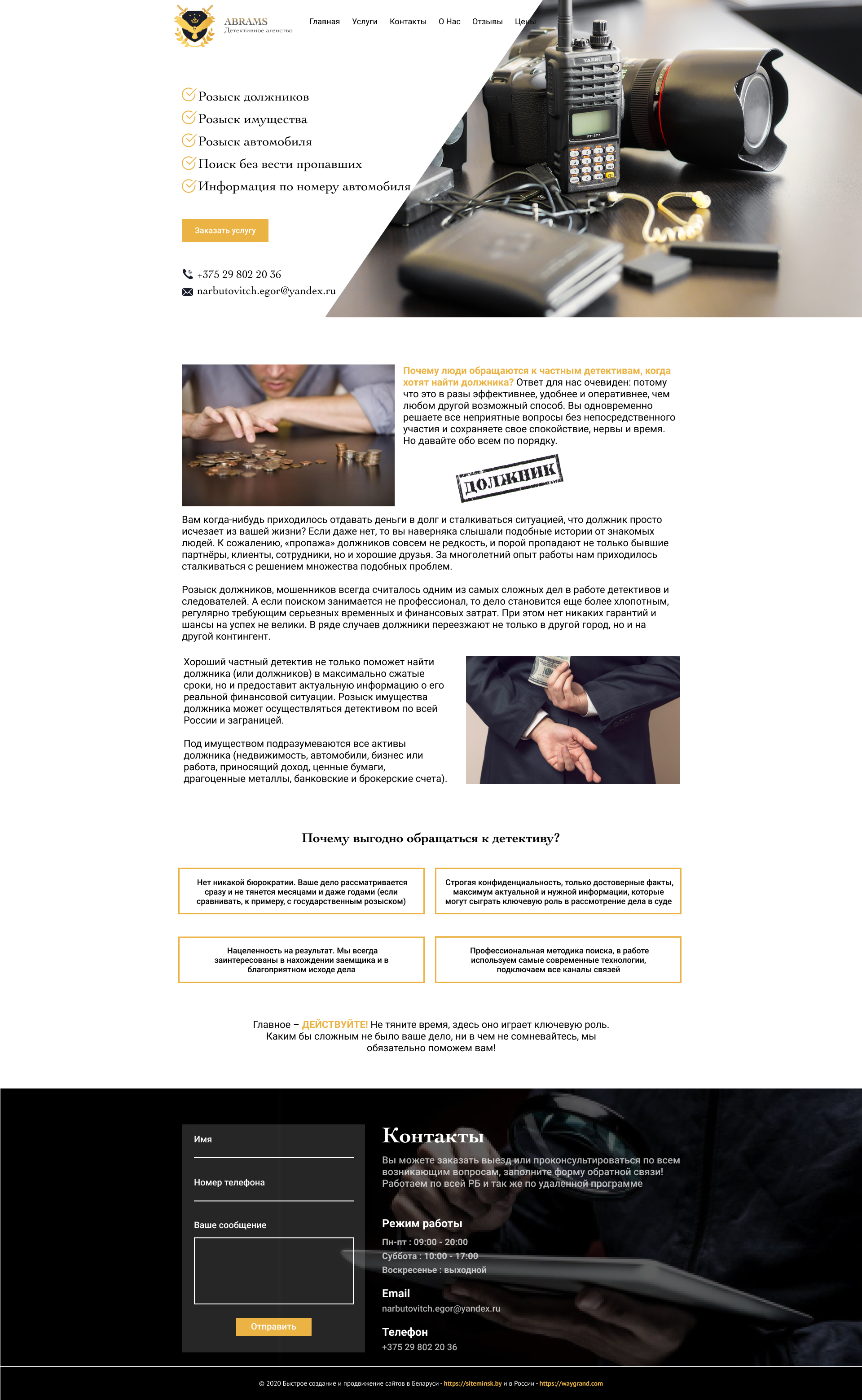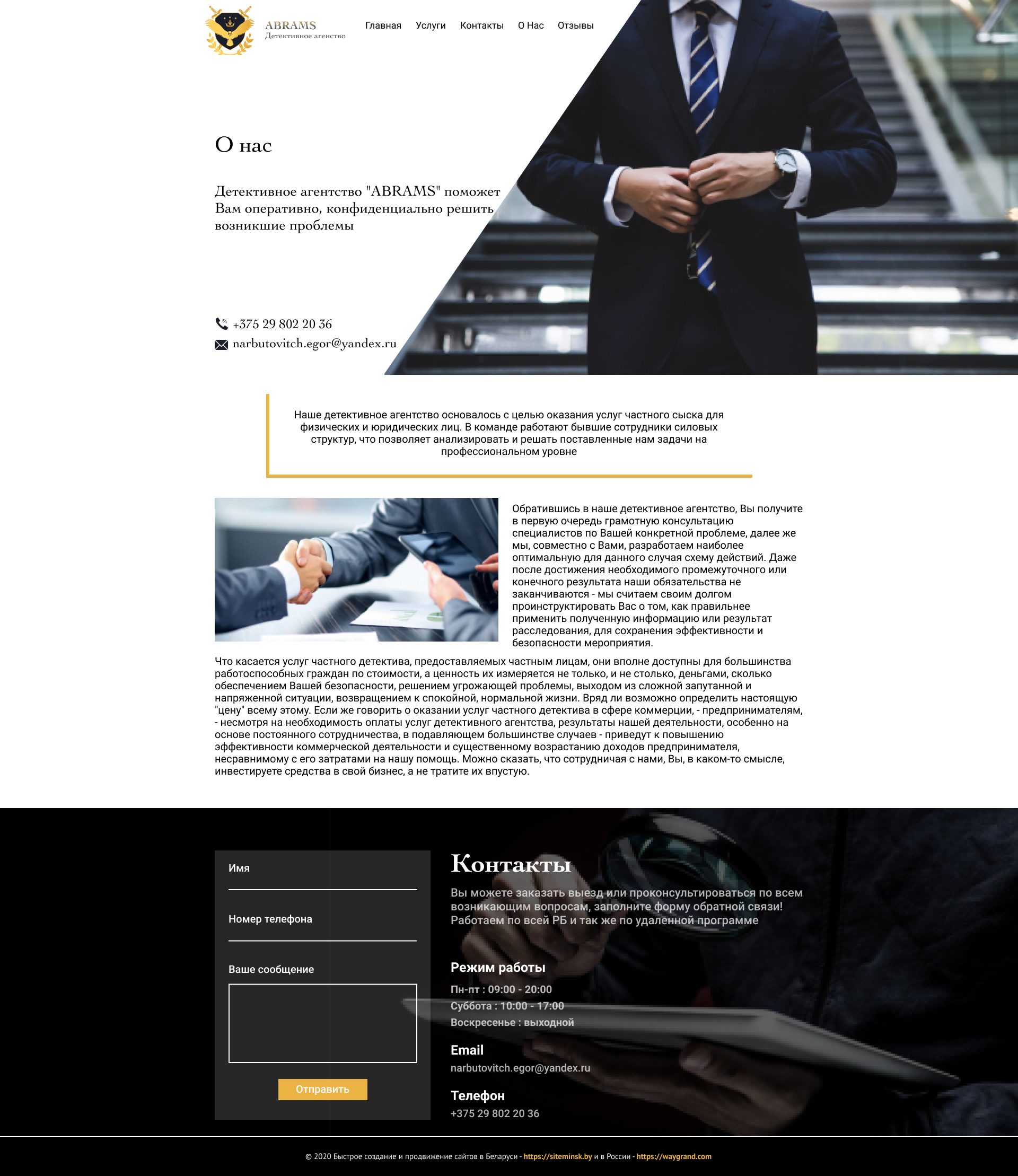 Закажите готовый продающий сайт визитка #239 в Братске за 5-7 дня «под ключ»: свёрстан, отрисован и готов к рекламе. Тематика шаблона «Частное детективное агентство».